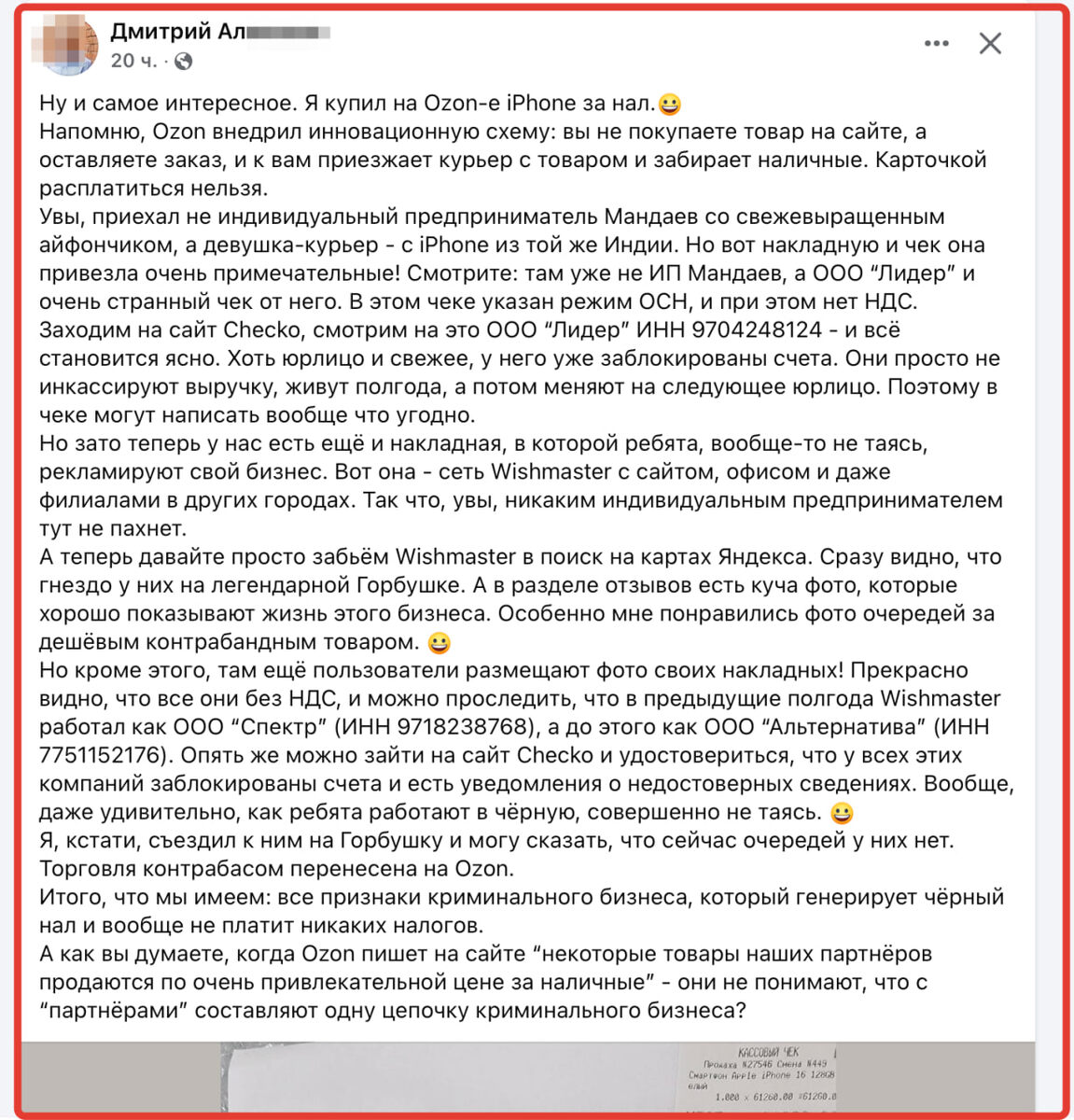 Это основатель сети ДНС пишет в запрещенной сети ФБ. Раскрывает то, как на Ozon продает, товар, очень похожие на контрафакт. Вот почему на маркетплейсах товары дешевле, чем в рознице, которая платит все налоги. И тут надо добавить, что основатель ДНС замечен в высказываниях про СВО, за которые на иного бы Васю обратили внимание разные органы. Но тут личное - ведь он топит своих конкурентов - маркетплейсы, которые забирают клиентов у розничных магазинов. Фейсбук, Мета, Инстаграм - признаны террористами в России