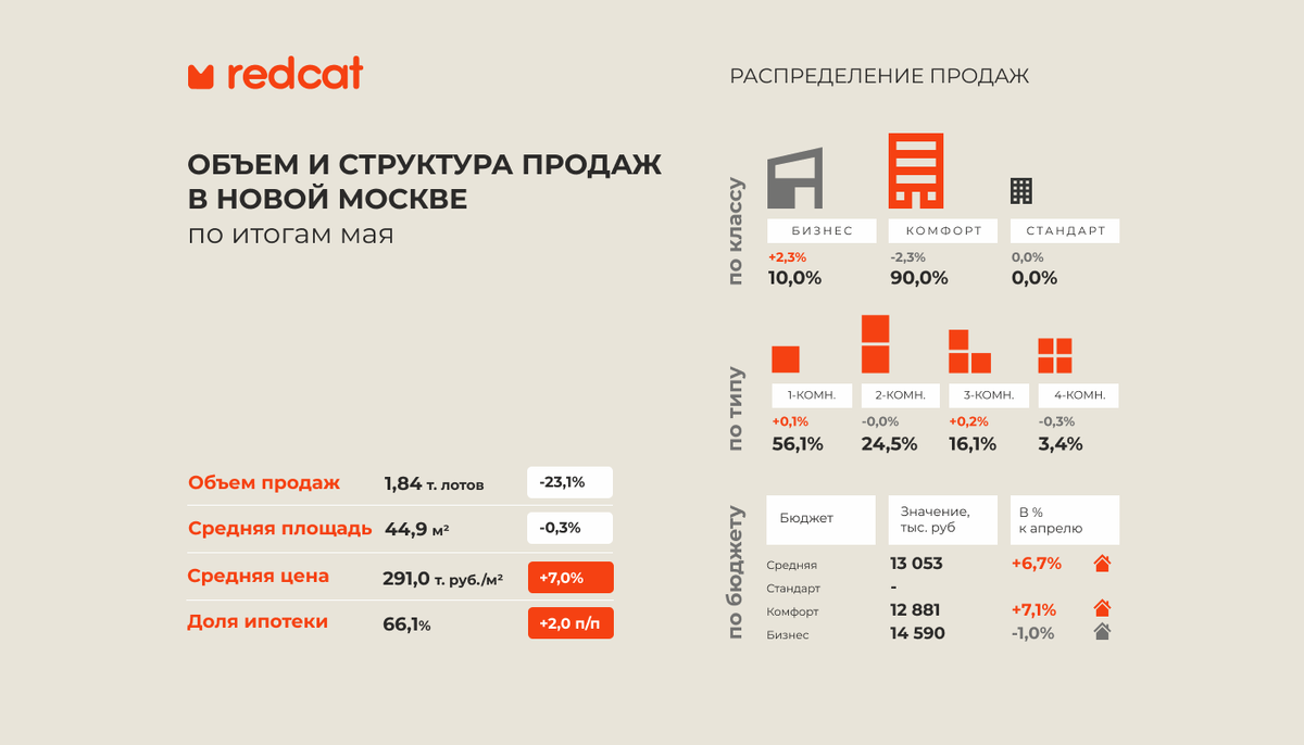 В Новой Москве в мае спрос провалился еще сильнее, чем в старых границах, но за счет того, что в феврале и апреле спрос показывал рост, текущее падение не обновило минимумы начала года. По итогам месяца в Новой Москве было продано 1,84 тыс. квартир и апартаментов, что на 23,1% меньше, чем в апреле. Если сравнивать текущие показатели с прошлым годом, то май этого показал результаты на 33,5% ниже, в мае 2024 года застройщики реализовали 2,77 тыс. лотов. В течение месяца все сокращение спроса сконцентрировалось в сегменте доступного жилья, количество сделок с квартирами бизнес-класса за месяц не изменилось, а с квартирами класса комфорт – сократилось на 25%. Так 90,0% (-2,3 п/п) всех сделок в Новой Москве приходится на новостройки комфорт-класса, доля бизнес-сегмента, поднялась на 2,3 п/п до 10,0%. Что касается структуры по количеству комнат, то чуть более активно спрос снижался в сегменте четырехкомнатных лотов (-28,7%), а вот все остальные типологии за месяц потеряли по 22% – 23% покупа