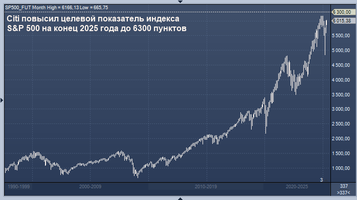 После того как индекс S&P 500 на прошлой неделе преодолел отметку в 6000 пунктов, стратеги с Уолл-стрит стали более оптимистично смотреть в будущее. График фьючерса на индекс S&P 500 интервалами в 1 неделю Майские данные по занятости оказались лучше ожиданий, что помогло индексу S&P 500 избавиться от опасений и подняться до отметки 6000 пунктов в пятницу. Это превзошло некоторые ожидания Уолл-стрит. Среди них — цель Джона Столцфуса, главного инвестиционного стратега Oppenheimer. В апреле он снизил целевой показатель индекса с 7100 до 5950. Закрытие индекса на отметке 6000,36 в пятницу стало самым высоким уровнем закрытия с 21 февраля. Теперь индекс находится на 20% выше своего минимума 8 апреля, что соответствует одному из определений бычьего рынка. Теперь и аналитики Citi повысили целевой показатель индекса S&P 500 на конец 2025 года до 6300 пунктов. Они объяснили это более оптимистичным взглядом на фундаментальные показатели и ожиданием сохранения текущего уровня оценки. По прогнозам