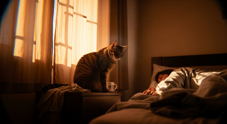 Просыпаюсь утром в семь, как обычно. Кот сидит на тумбочке, смотрит с недоумением. Мол, рановато, хозяин. Ложится поперёк меня, мурлычет убаюкивающе. Засыпаю обратно.