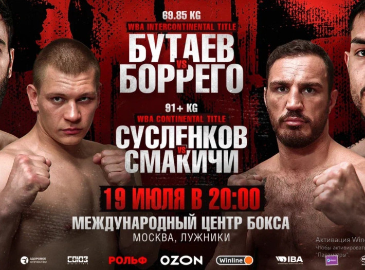 19 июля в Москве на площадке Международного центра бокса состоится большой вечер бокса, который будет показан в прямом эфире на Первом канале. В главном событии шоу экс-чемпион мира в полусреднем весе Раджаб Бутаев проведёт бой за титул WBA Intercontinental в полусредней дивизионе против мексиканца Хосе Мигеля Боррего. В со-главном бою вечера перспективный российский тяжеловес Артём Сусленков сразится за титул WBA Continental с хорватским боксёром Агроном Смакичи, который известен тем, что сорвал первый бой Тайсона Фьюри с Александром Усиком, нанеся серьёзное рассечение Фьюри на финальных спаррингах перед боем. Вечер бокса будет организован промоутерской компанией СОЮЗ при поддержке Федерации бокса России.