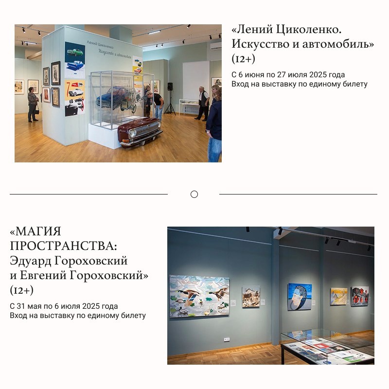 Две выставки открылись в НГХМ|ИСКУССТВО ХХ ВЕКА С разницей меньше чем в неделю в НГХМ|ИСКУССТВО ХХ ВЕКА на площади Минина открылось сразу две выставки: «МАГИЯ ПРОСТРАНСТВА: Эдуард Гороховский и Евгений Гороховский» (12+). Здесь представлены работы двух художников нон-конформистов – отца и сына – Эдуарда и Евгения Гороховских, расцвет творчества которых пришелся на вторую половину прошлого века. Оба художника, используя похожие техники, очень по-разному исследуют пространство – один внешнее, другой внутреннее, переходя в своем творчестве на совершенно новый уровень, где есть место чему-то сверхреальному и даже магическому. Выставка «Лений Циколенко. Автомобиль и искусство» (12+) рассказывает о творчестве художника – создателя дизайна культового автомобиля конца 70-х и 80-х годов прошлого века «Волга. ГАЗ-24». В экспозиции представлены графические и живописные работы автора разных лет из корпоративных и частных коллекций, кроме того, вы сможете увидеть фрагмент оперения кузова «Волг
