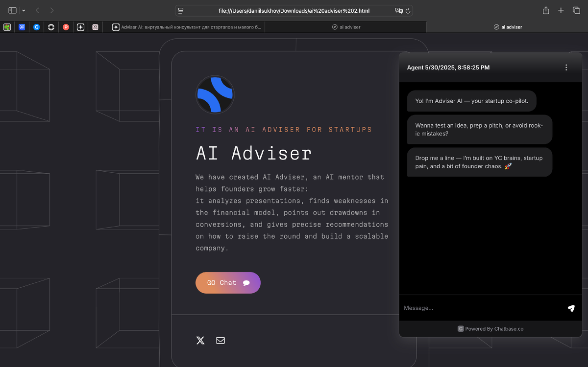 В мире, где каждое решение может стать судьбоносным, важно иметь за плечами не просто советчика, а коллегу, который глубоко понимает, как выстроить успешный стартап. Наш Adviser AI — это именно такой партнёр: он обучен на базе лучших книг, лекций и материалов Y Combinator, опираясь на проверенные практики, опыт сотен стартапов и инсайты ведущих инвесторов. ЗадачаВозможность AI-советникаФормирование MVPПоможет выделить минимальный набор функций и расставить приоритеты по ценности для пользователя.Валидирование гипотезПредложит методику A/B-тестов, рассчитает необходимый бюджет и целевой CTR.Подготовка к питчуСоставит структурированную презентацию с разделами: проблема, решение, рынок, команда, финансовая модель.МасштабированиеОценит ваши unit-economics, предложит оптимизацию каналов продаж и рекламных кампаний.Рыночный анализПроведёт SWOT и пяти сил Портера, подскажет, где найти данные по TAM/SAM/SOM. Попробуйте Adviser AI бесплатно и сделайте первый шаг к масштабированию вашего старта
