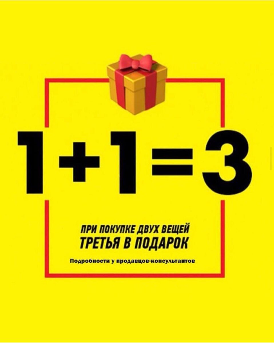 Ура!!! Мы запускаем очень выгодную акцию 🔥 Берёте 3 вещи, а платите только за 2 . Все подробности акции уточняйте у продавцов. В акции участвуют не все группы товаров. Ждём Вас в наших магазинах Арена, 4 этаж Ультра, 3 этаж Галактика, 2 этаж