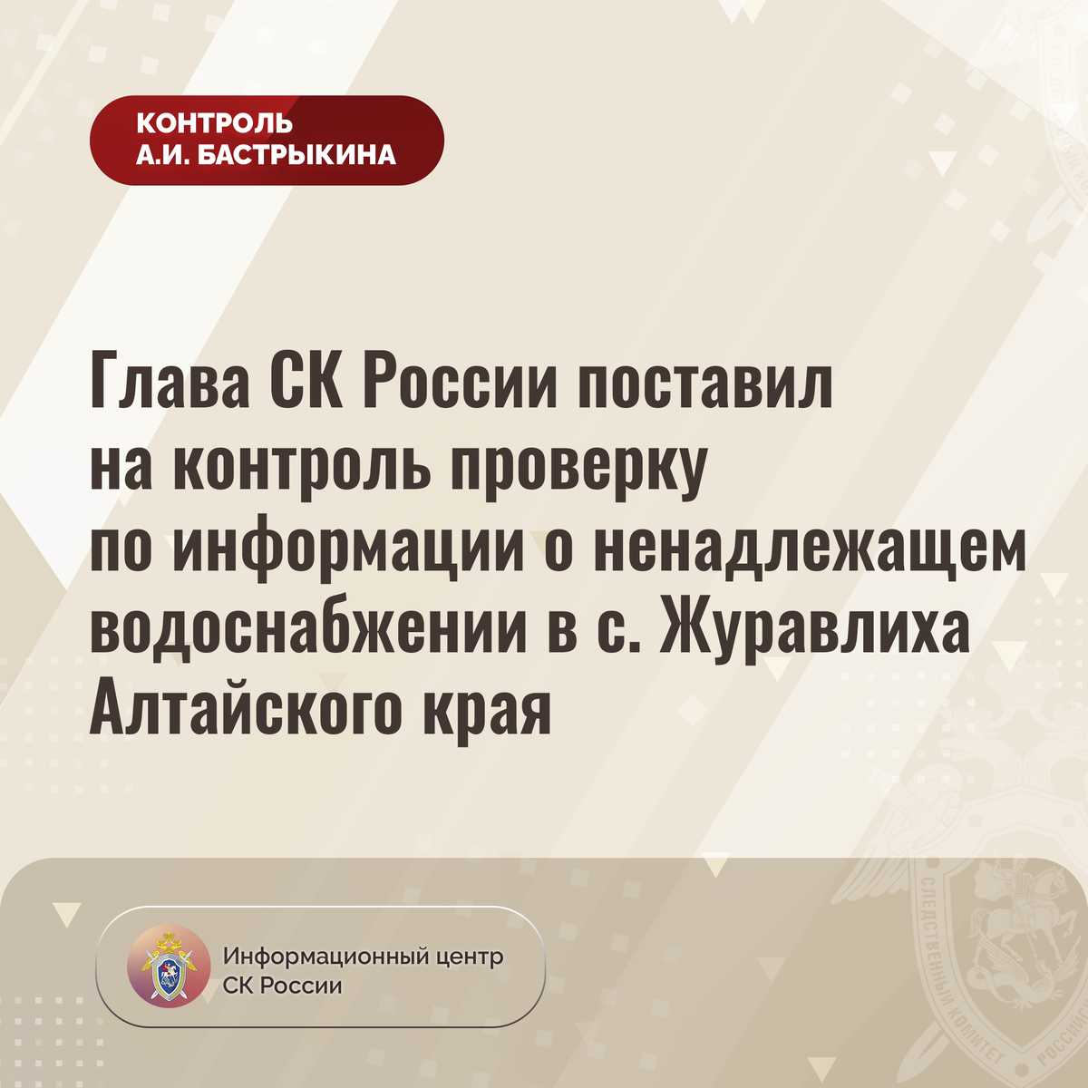 Глава СК России поставил на контроль проверку по информации о ненадлежащем водоснабжении в с. Журавлиха Алтайского края В СМИ сообщается, что в селе Журавлиха Алтайского края на протяжении длительного времени из-за ненадлежащего обслуживания и содержания инженерных сетей в жилые помещения поступает непригодная для потребления и бытовых нужд вода, имеющая примеси ржавчины. Кроме того, в поставляемом ресурсе граждане обнаружили червей. Многочисленные обращения в компетентные органы результатов не принесли, мер к разрешению ситуации не принято. В СУ СК России по Алтайскому краю по данному факту организована процессуальная проверка. Председатель Следственного комитета Российской Федерации Александр Иванович Бастрыкин поставил ход процессуальной проверки на контроль в центральном аппарате ведомства и поручил руководителю СУ СК России по Алтайскому краю Игорю Владимировичу Колесниченко представить доклад о ее промежуточных результатах и принятом по итогам решении. #СледственныйКомитет #СКРо