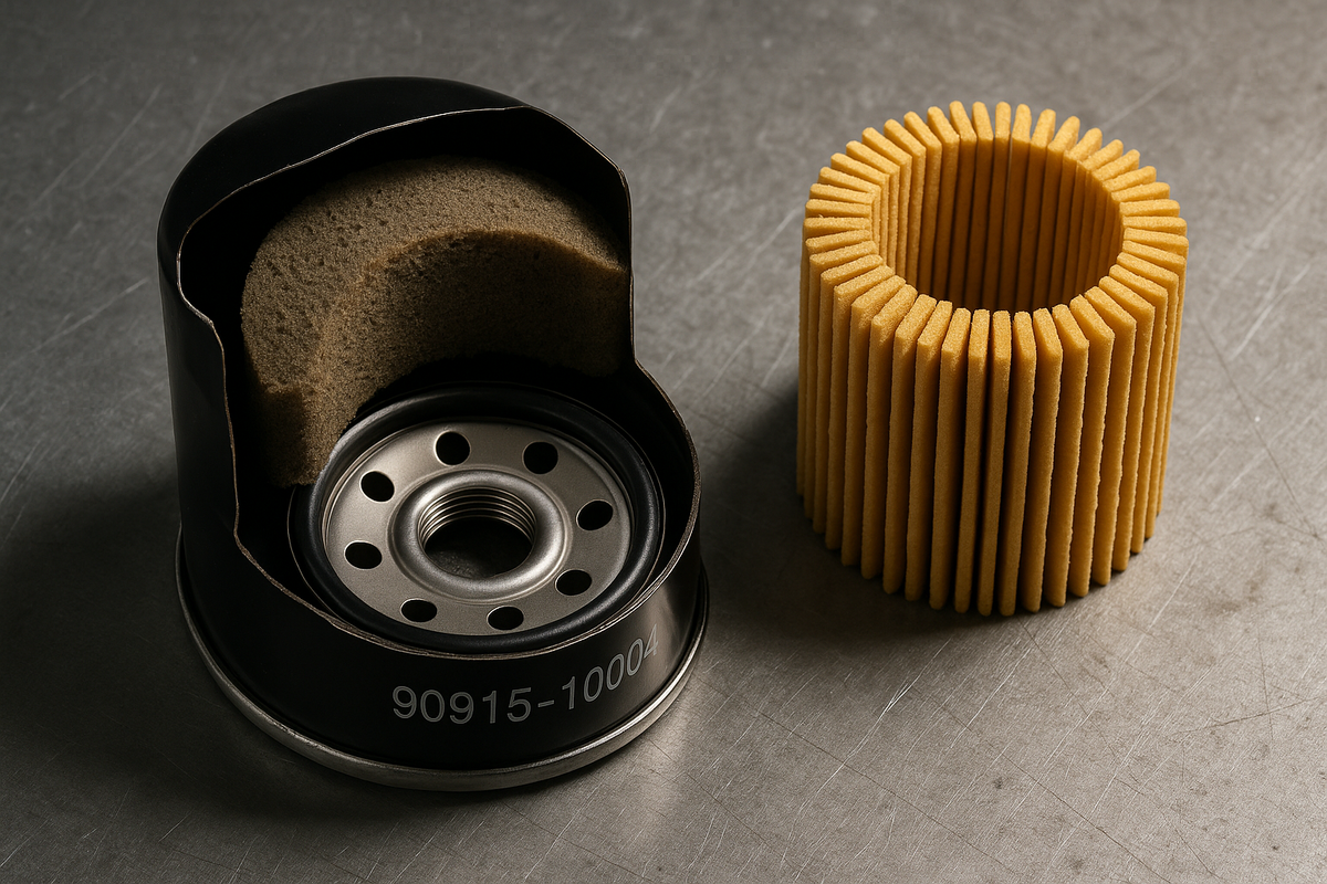 90915-10004 — японский оригинал, без суффиксов, чуть крупнее по размеру и... совсем другой внутри. 🔍 Внутри — не бумага, а «губка»! Фильтрующий элемент у 90915-10004 — не бумажная гармошка, как у всех, а синтетический пористый материал.