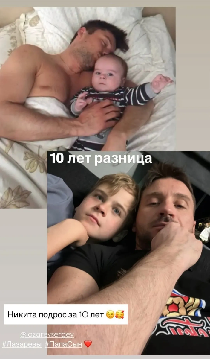 Накануне 42-летний Сергей Лазарев порадовал подписчиков редкими кадрами с сыном Никитой. Певец опубликовал в своем микроблоге в соцсети две фотографии: одну — где Никита еще совсем малыш, и вторую — свежую, снятую через 10 лет после первой. На обоих снимках знаменитость с сыном лежал на кровати. Таким образом артист обратил внимание фанатов на то, как изменился его наследник. Поклонники обратили внимание на то, как ребенок похож на звездного родителя. Самые заинтересованные фанаты даже принялись исследовать детские снимки экс-солиста Smash!! В результате публика разделилась на два лагеря. Одни предположили, что по мере взросления Никита все больше будет похож на отца. Другие же посчитали, что у сына знаменитости совершенно другие внешние данные. Напомним, у Сергея Лазарева двое детей. Помимо сына Никиты, у артиста есть шестилетняя дочь Анна. В мае исполнитель хита «Сдавайся» ходил к ней на выпускной в детском саду. Недавно Сергей Лазарев с юмором показал свою «эклерную диету».