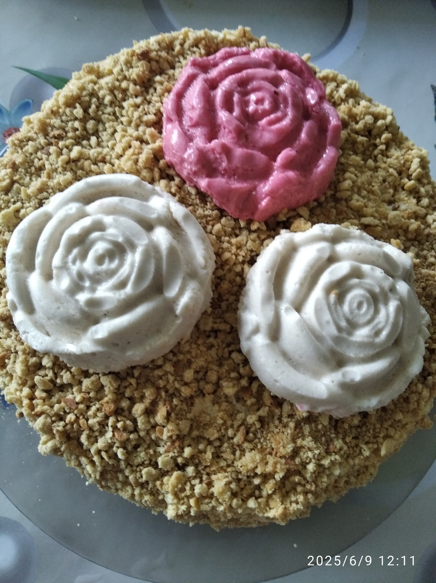Состав: тесто: -мука-200г. -мёд-80г. -сл.масло-100г. -яйцо-3 -сахар-100г. -сода-1ч.л. -соль-3г. крем: -сметана-400г. -с.масло-150г. -сахар-110г. -ванилин-1г. -крахмал-20г. Приготовление: В глубокой миске смешайте: мед, сахар, соль и соду, добавьте сливочное масло и поставьте на водяную баню или на медленный огонь. Постоянно помешивайте, пока смесь не начнет пениться. После этого снимите с огня и дайте немного остыть. В остывшую массу вбейте яйца по одному, тщательно перемешивая после каждого добавления. Постепенно добавляйте муку, замешивая тесто до однородной консистенции. Тесто можно выпекать в форме, либо залить в противень и выпечь пласт, а готовый разрезать как захочется. При 180 градусах пласт выпекается 15- мин. Вырезаем коржи под размер формы для тортов, коржи тоже режем каждый на два, чем тоньше корж, тем лучше он пропитается кремом, а оставшиеся обрезки размалываем на измельчителе. Для крема смешиваем :сметану, сахар, ванилин, крахмал и ставим чашку на паровую баню .При п