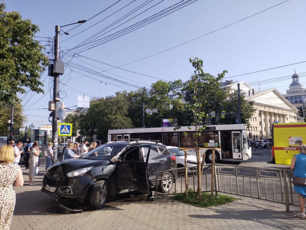 Разбитое стекло и "помятая" дверь. В центре Воронежа иномарка столкнулась с автобусом №64
