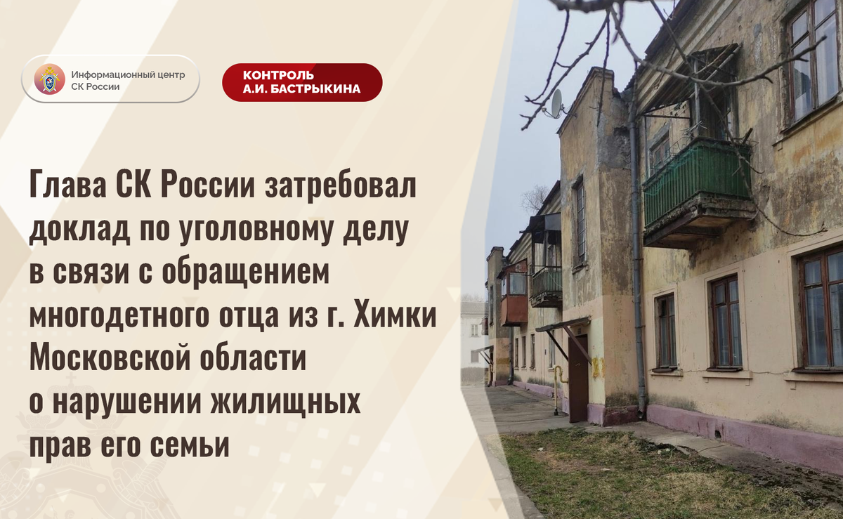 Глава СК России затребовал доклад по уголовному делу в связи с обращением многодетного отца из г. Химки Московской области о нарушении жилищных прав его семьи В комментарии в аккаунте приемной Председателя СК России А.И. Бастрыкина «ВКонтакте» размещено обращение многодетного отца из города Химки Московской области по вопросу несогласия с ходом установления обстоятельств нарушения жилищных прав его семьи. Мужчина с супругой, ее родственниками и четырьмя детьми проживает в малогабаритной коммунальной квартире в ветхом здании по улице Павлова, 1939 года постройки. Из-за постоянной сырости в помещениях распространилась плесень, что негативно сказывается на состоянии их здоровья. Несмотря на то, что в 2014 году износ конструкций строения составлял более 70%, до настоящего времени оно аварийным не признано, благоустроенное жилье семье не предоставлено. Многочисленные обращения в компотные органы результатов не принесли. Ранее указанная ситуация освещалась в социальной сети. А.И. Бастрыкин