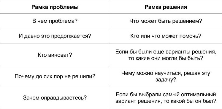 Самый базовый прием, который можно использовать и с целью атаки на оппонента и с целью защиты - это Рамка Проблемы и Рамка Результата. Рамка в НЛП это такой контекст рассмотрения какого-либо явления, при помощи которого можно изменять оттенок его восприятия. Это дополнительная информация, которая даётся параллельно или перед основной информацией и задаёт логические или эмоциональные рамки её восприятия для формирования определённого отношения Рамка или фрейм - это универсальное и базовое понятие в НЛП и применяется в различных контекстах, о которых более глубоко и детально мы говорим на наших тренингах. Из простого, что можно сделать, когда тебя втягивают в негатив, жалобы или обвинения - держать рамку, ибо кто держит рамку, тот управляет разговором. Итак, Рамка проблемы — это специфическим образом составленные вопросы, который акцентируют фокус на прошлом, вине, сложности: «Почему это опять не сработало?» «Кто виноват?» «Ты опять всё испортил!» Рамка результата/решения — фокус на буду