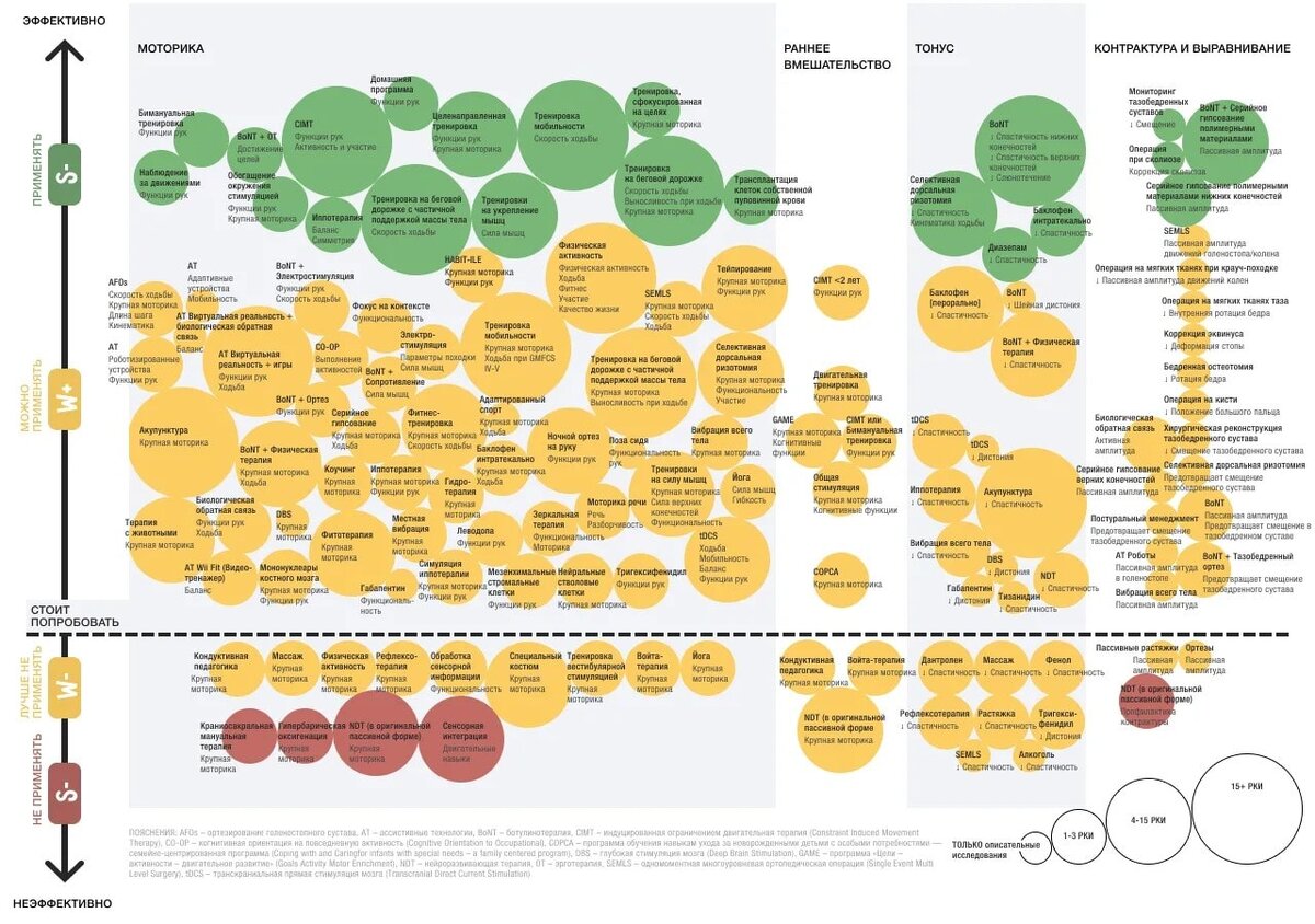 Продолжая разговор о реабилитации детей с диагнозом ДЦП, я хотела бы озвучить Вам информацию о методах, которые мы применяли в работе с Владом. Но прежде, хочу поделиться интересной информацией. В 2013 году команда вместе с профессором И. Новак из Австралии, посвятившей жизнь улучшению качества жизни людей с ДЦП, создала подробный обзор различных методов терапии для детей с этим диагнозом. С тех пор он дополнялся, и в 2020 году вышло полное обновление — "Состояние доказательной базы «Светофор» 2019: Систематический обзор вмешательств для профилактики и лечения детей с церебральным параличом". Этот обзор представляет собой систему координат с разноцветными кругами: Зелёный круг — Вперёд! Это методы, доказавшие свою эффективность, их можно использовать. Красный круг — Cтоп! Это не лучший выбор, так как терапия либо бесполезна, либо может навредить ребёнку. Жёлтый круг — Мера! Здесь минимальные доказательства эффективности, но метод стоит попробовать и оценить его пользу для ребёнка. А во