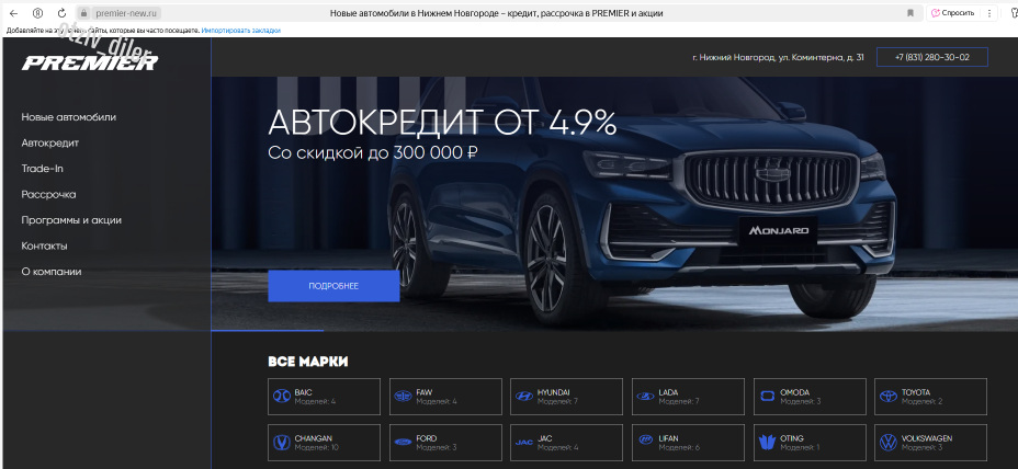 В автоцентре Premier в Нижнем Новгороде можно купить как новый, так и подержанный автомобиль. Салон открылся недавно, широкую известность пока не получил. Ранее по этому адресу находился автосалон Spyne — дилер из нашего черного списка. Согласно данным Я.Карт он больше не работает.