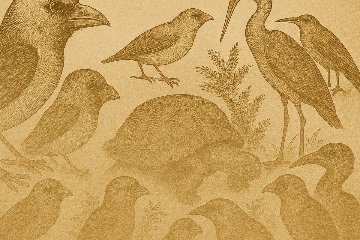 Дарвин вспоминает свои наблюдения на Галапагосах, где пересмешники на разных островах слегка различались по оперению и форме клюва, намекая на адаптацию к местным условиям и расхождение от общего предка.