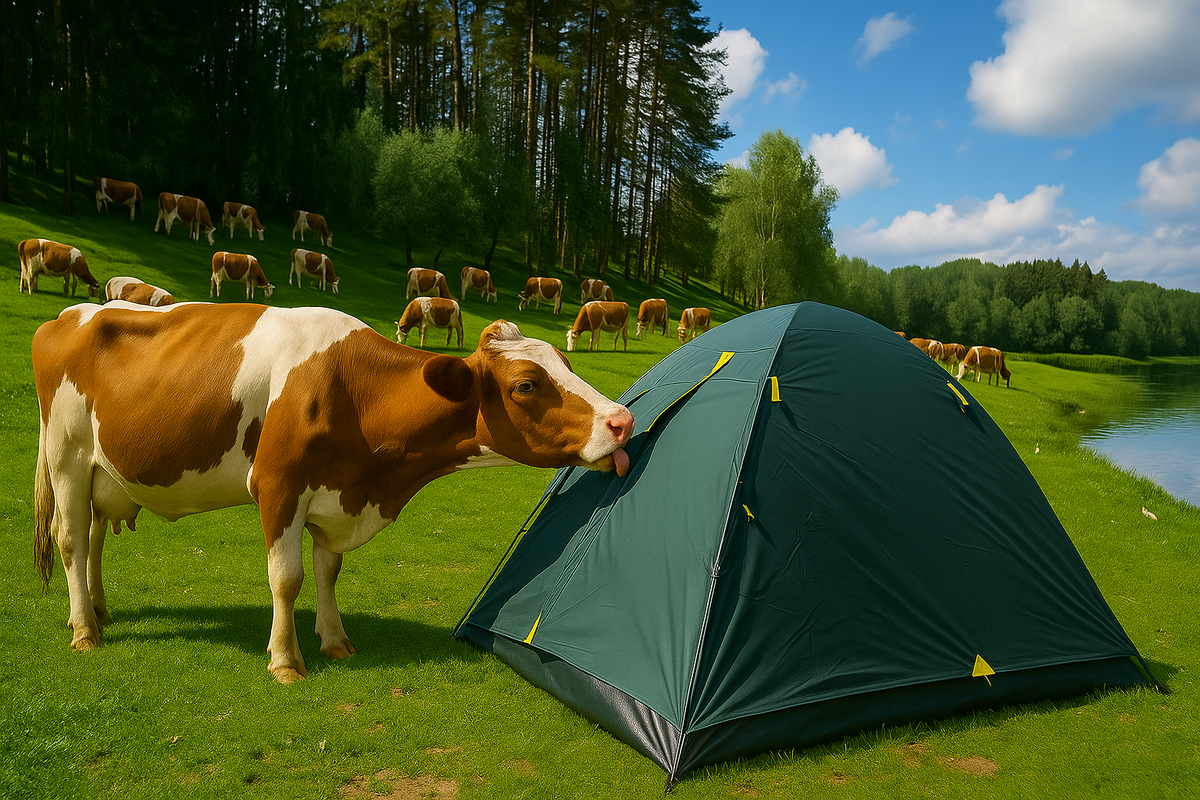 Одна из самых шустрых и наглых буренок 🐮 шагнула вперед и потянулась своим шершавым языком прямо к тенту палатки, явно желая попробовать его на вкус. 👅 Я встал стеной между палаткой и этим любопытным языком, зашикал на нее. Она недовольно отступила на пару метров, другие тоже немного попятились. Но две особо упертые особи, казалось, плевать хотели на издаваемые мной звуки, все так же неумолимо приближаясь к каяку и моим вещам.