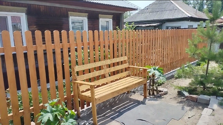 Помните мой муж сделал подарок тёще, тот который она хотела, мы не ставили лавочку на место, поставили они после покрытия лаком и как она блин ( так и хочется сказать) здесь вписалась , сочетается с забором и растениями, особенно с хвойными.