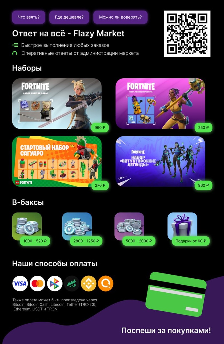 🎮 Flazy Market — №1 Fortnite магазин! 🔥 Хочешь выгодно купить В-Баксы, скины и боевые пропуски? Тогда тебе к нам! 💸 Самые сочные цены и мгновенная доставка! 📦 Наборы: — Ниндзя Сары — 960₽ — Революция граффити — 250₽ — Стартовый набор Сагуаро — 600₽ — Потусторонние легенды — 800₽ 💰 В-Баксы по лучшим ценам: 1,000 — 520₽ 2,800 — 1250₽ 5,000 — 2000₽ 13,500 — 5000₽ 🎁 Подарки: От 200 V-баксов всего за 60₽ и выше! 📲 Заказ и подробности: @FlazyMarket_bot Новости и акции: @FlazyNews 💳 Поддержка всех популярных способов оплаты! Не упусти шанс — обнови инвентарь выгодно