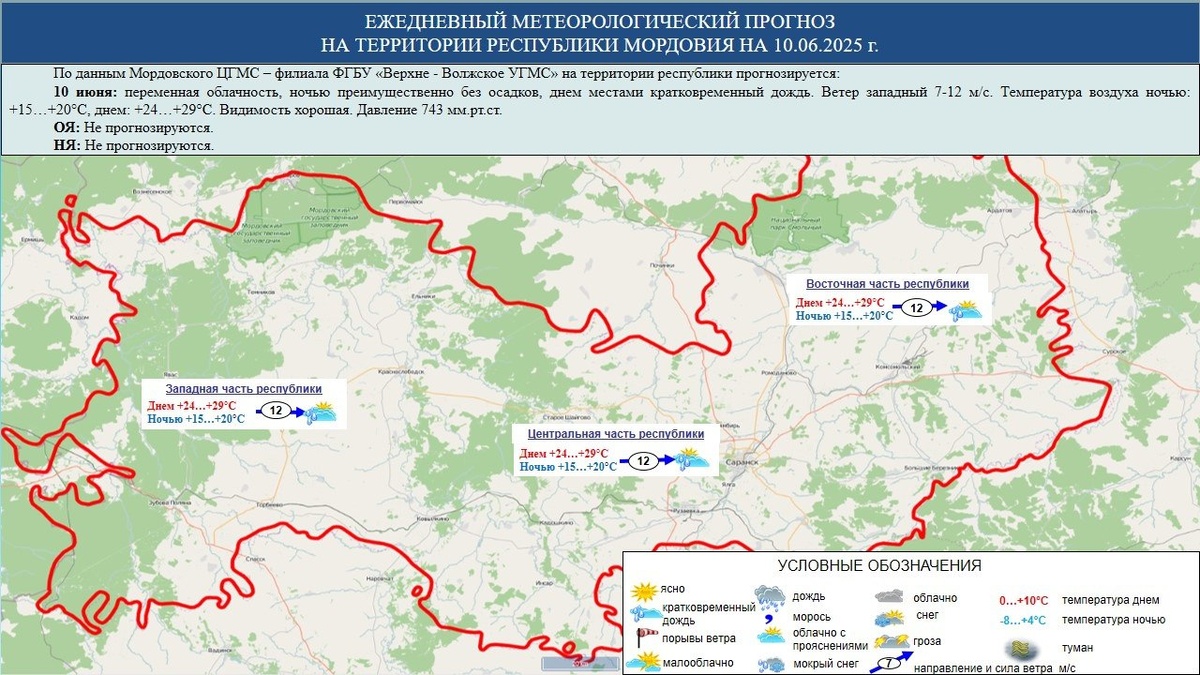 ☁️⛅⛈️ 10 июня в Мордовии переменная облачность, ночью преимущественно без осадков, днем местами кратковременный дождь. Ветер западный 7-12 м/с. Температура воздуха ночью: +15…+20°С, днем: +24…+29°С. Давление 743 мм рт. ст. Происшествия | Подписаться | Предложить новость