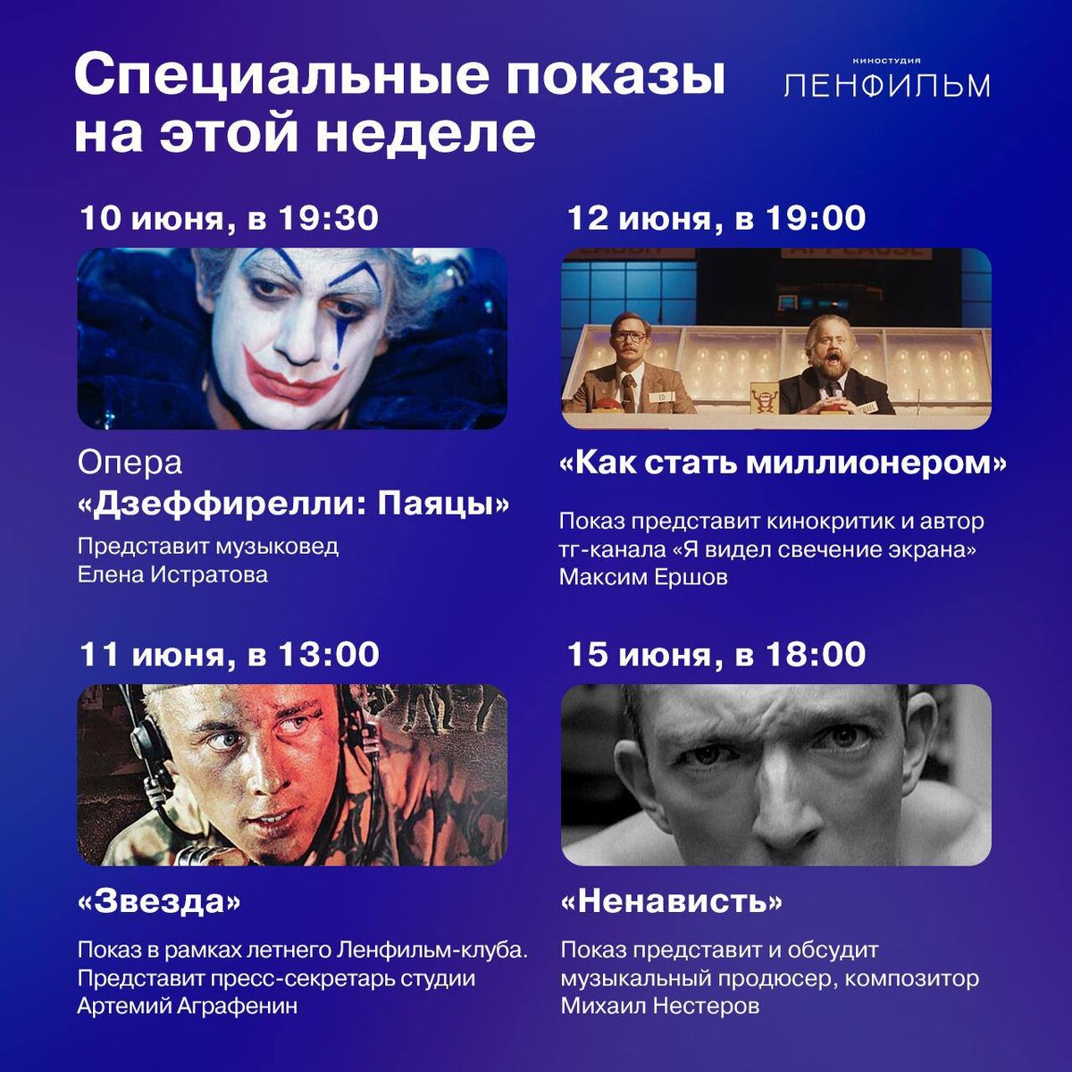 Специальные показы на этой неделе: 🍿10 июня, в 19:30 — «Дзеффирелли: Паяцы». Представит музыковед Елена Истратова; 🍿11 июня, в 13:00 — «Звезда». Показ в рамках летнего Ленфильм-клуба. Представит пресс-секретарь студии Артемий Аграфенин; 🍿12 июня, в 19:00 — «Как стать миллионером». Показ представит кинокритик и автор тг-канала «Я видел свечение экрана» Максим Ершов; 🍿15 июня, в 18:00 — «Ненависть». Показ представит и обсудит музыкальный продюсер, композитор Михаил Нестеров. #ЛенфильмРекомендует