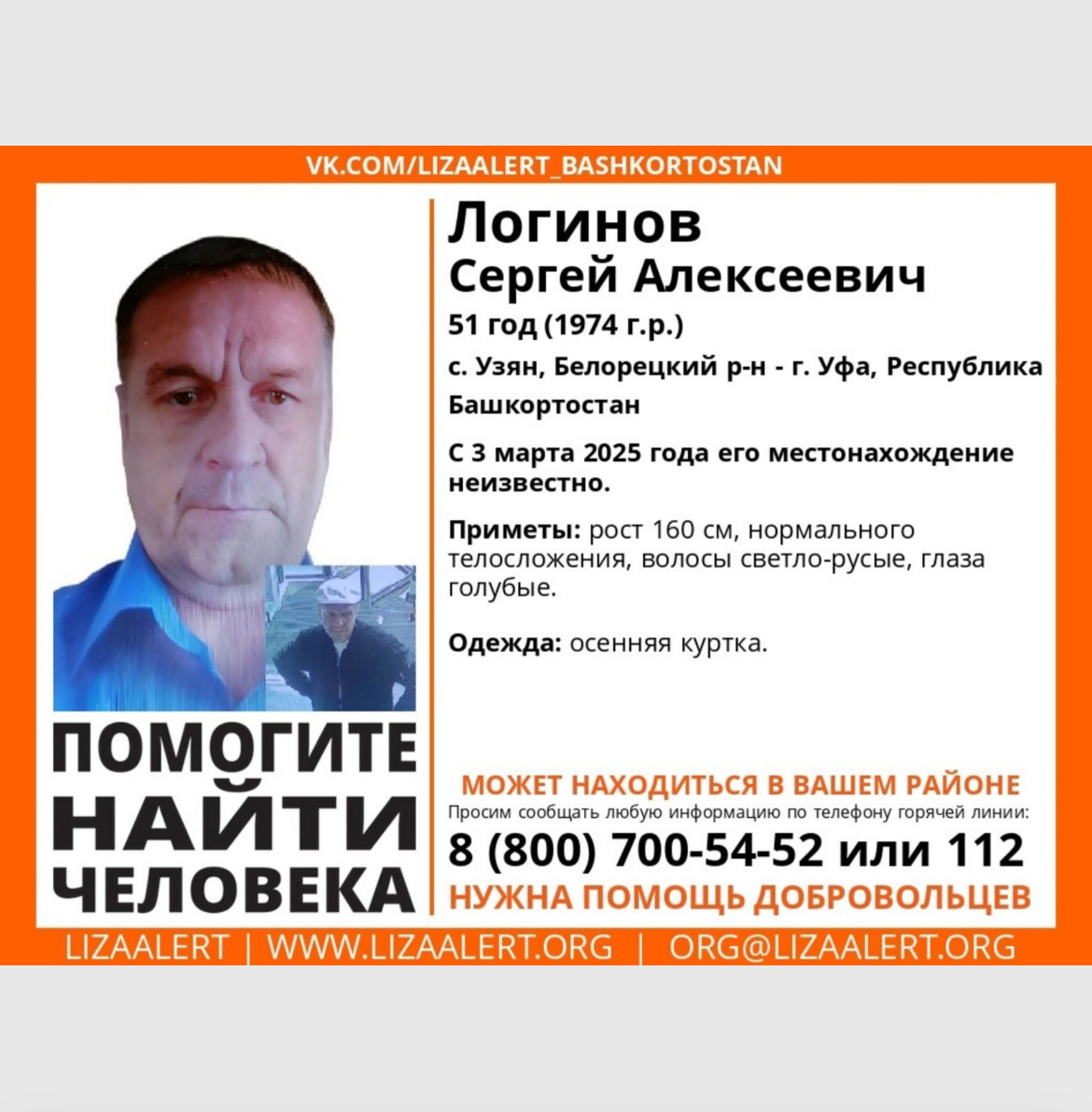 В Башкирии пропал 51-летний Сергей Алексеевич Логинов В Башкирии пропал 51-летний Сергей Алексеевич Логинов. В качестве возможных мест указаны село Узян Белорецкого района и город Уфа. Как сообщает поисковый отряд «Лиза Алерт Башкортостан», с 3 марта 2025 года его местонахождение неизвестно. Приметы: рост 160 см, нормального телосложения, волосы светло-русые, глаза голубые. Был одет в осеннюю куртку. Контактный телефон: 8-800-700-54-52 или 112.
