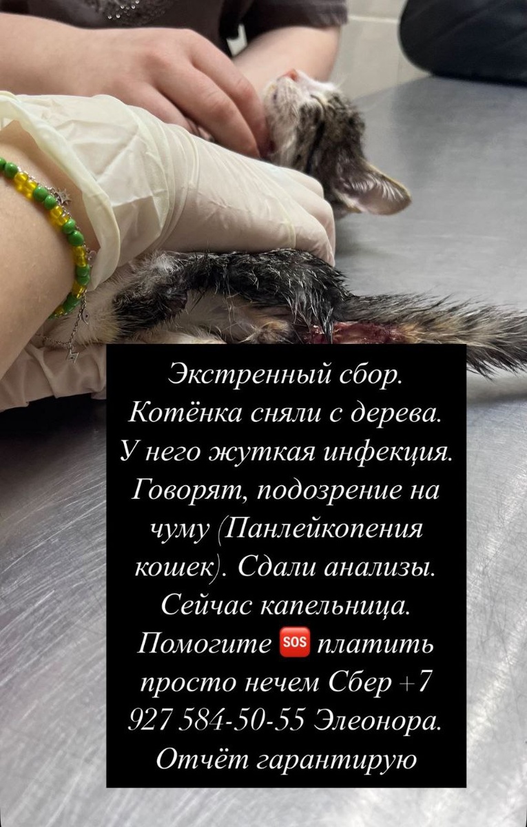 Экстренный сбор. Котёнка сняли с дерева. У него жуткая инфекция. Говорят, подозрение на чуму (Панлейкопения кошек). Сдали анализы. Сейчас капельница. Помогите 🆘 платить просто нечем Сбер +7 927 584-50-55 Элеонора. Отчёт гарантирую