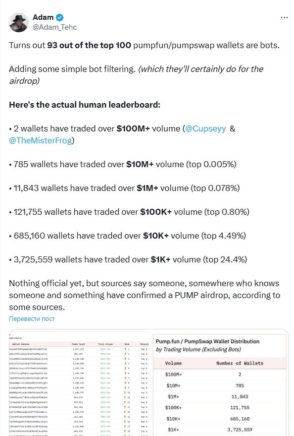 🔸Согласно данным Adam_Tehc, 93 из 100 крупнейших кошельков по объему торгов на Pump Fun/PumpSwap являются ботами — так определены кошельки, активные свыше 18 часов в сутки. Среди всех кошельков: