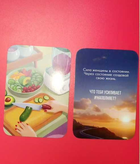 Судя по этим картам, скорее всего, пришло время пересмотреть свой образ жизни. Возможно, пора уделить внимание своему телу, здоровью, подпитать себя витаминчиками, перейти на более полезный рацион. Может быть, даже пройти чек-ап своего здоровья, обратиться к врачу, если это требуется. И это даст вам ресурс на этой неделе. А ещё по этой карте я вижу завуалированное послание о том, что пришло время от чего-то отказаться, условно, отрезать, убрать из своей жизни. И, в результате, у вас высвободится огромное количество энергии. И карта-подсказка: "Сила женщины (и мужчины) в состоянии. Через состояние создавайте свою жизнь". Ответьте себе на вопрос: "Что вас усиливает и наполняет?" Это и будет вашим ресурсом на этой неделе! Всем классной недели!