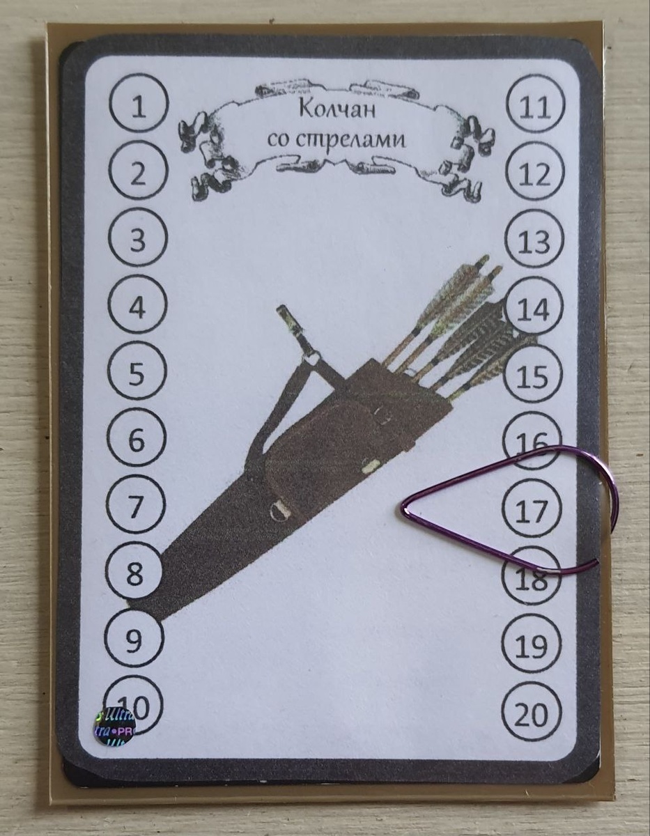 Мои игроки любят карточки. Особенно карточки предметов. И я их им даю ) Но некоторые предметы предполагают учёт их количества. Классический пример — стрелы. Они то убывают, то прибавляются. Не хранить же 20 одинаковых карточек стрелы. Поэтому я решил нарисовать на таких предметах счётчик, а текущее значение обозначать фигурной скрепкой. Удобно, что это значение сохраняется и между сессиями. Можно использовать не только для предметов — расходников (рационы, зелья и т.п.). А, например, для монет. С двумя рядами цифр и двумя скрепками — для единиц и десятков. Если кто-то из подписчиков придумает, как скомпоновать, чтобы третьей скрепкой можно было обозначить сотни — будет круто. А ещё для хитпоинтов, эффектов и состояний. #handmade@dndpotustoronu