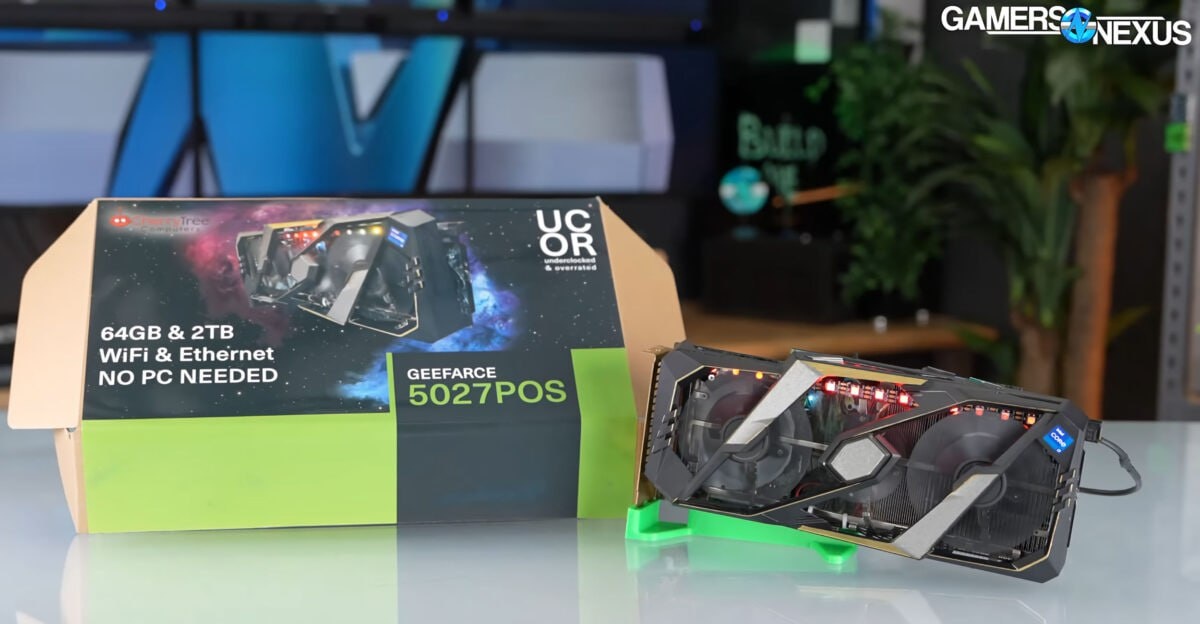 CheeryTree представила GeeFarce RTX 5027 — необычный мини-ПК, внешне полностью имитирующую видеокарту. Под кулером спрятан мини-ПК на базе ASUS NUC 13 Pro с процессором Intel Core 13-го поколения, 64 ГБ оперативной памяти и SSD на 2 ТБ. Это не серийный продукт, а скорее экспериментальный проект, наглядно высмеивающий рост габаритов современных видеокарт. Тестированием занимался канал Gamers Nexus, подтвердив, что, несмотря на шуточный облик, система полностью рабочая.