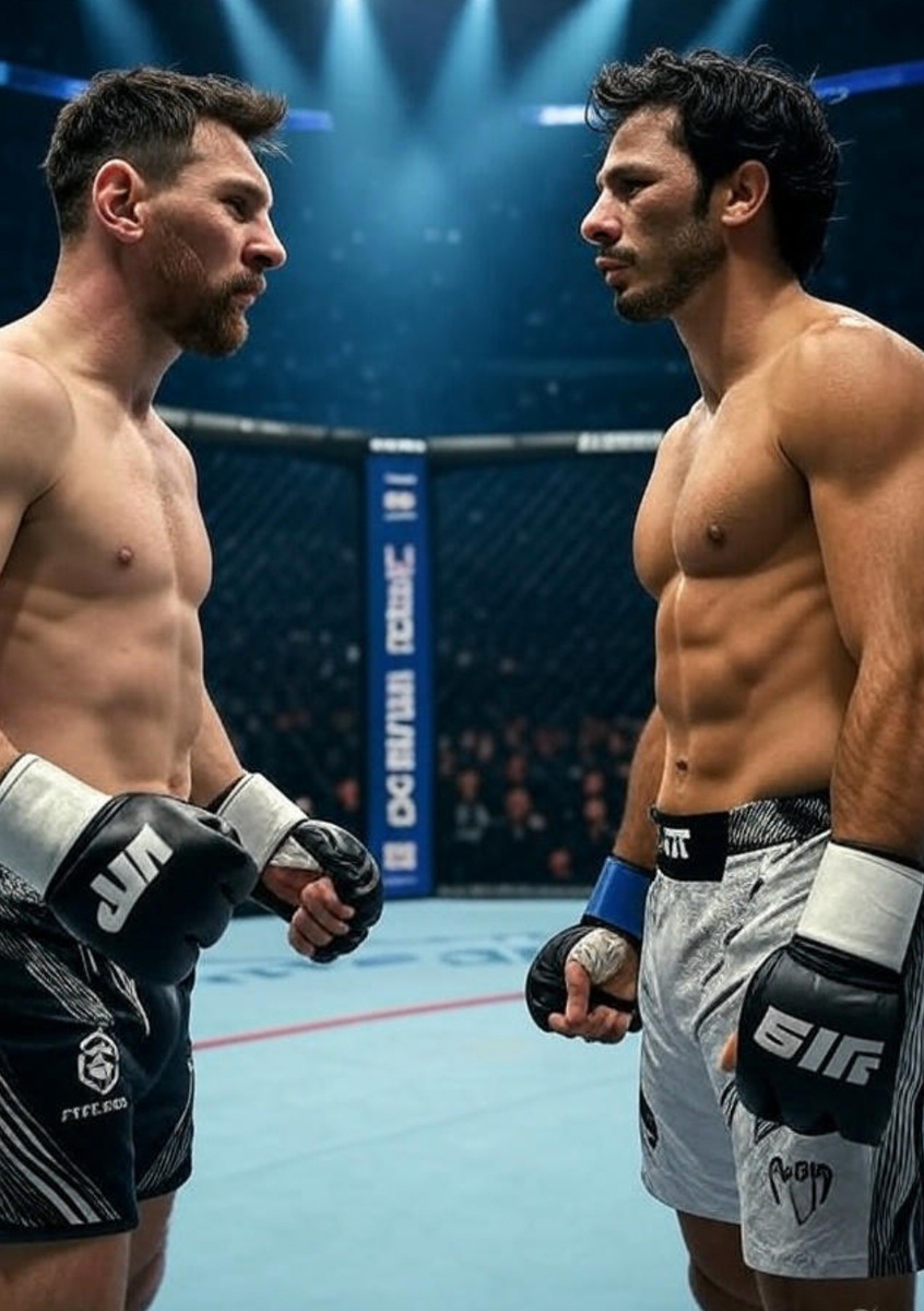 Это был бы шахматный поединок стиля и выносливости! Пантожа, бразильский гений джиу-джитсу, давит прессингом и мастерски переводит бои в партер, где его удушающие (как против Морено) становятся фатальными. Месси мог бы превратить свой футбольный дриблинг в октагонные пируэты, уходя от тейкдаунов с нечеловеческой ловкостью, как от подкатов на поле. Представь: он кружит вокруг Пантожи, нанося лёгкие, но частые удары, выматывая чемпиона своим кардио, отточенным за годы на поле. Пантожа, скорее всего, пошёл бы в клинч, используя своё джиу-джитсу для сабмишена, но Месси, с низким центром тяжести, мог бы выстоять, балансируя и ища шанс для контратаки. Шансы 35/65: чемпионство в зоне досягаемости, если он освоит базовый грэпплинг — его шанс на победу через решение в стойке реален против усталого Пантожи!