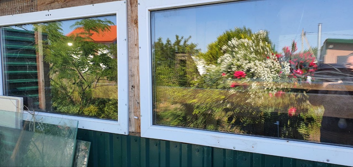 В окнах моего курятника отражаются цветущие розы и жасмин.