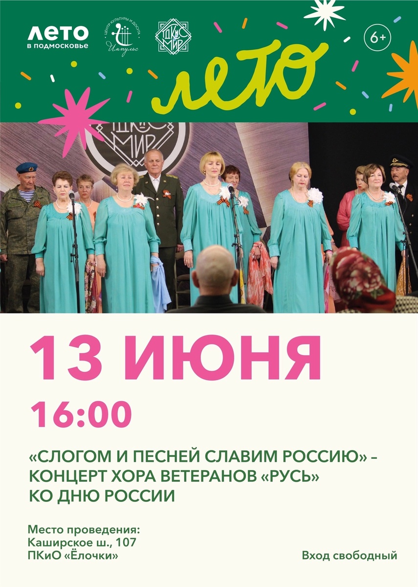 ✨ Приглашаем вас провести незабываемый день России вместе с нами! Тема вечера: «Слогом и песней славим Россию» Концерт хора ветеранов «Русь» Приходите насладиться вдохновляющим выступлением, проникнуться духом патриотизма и поддержать наших ветеранов. Бесплатный вход для всех желающих! Не пропустите возможность провести время в дружеской и теплой атмосфере, наполненной гордостью за Родину. До встречи на концерте! 🚫 Возраст: 6+ 📆 13.06.2025🕒16:00 🏢 Дворец культуры и спорта «Мир» 📍 г. Домодедово, Каширское шоссе, д.100А 💰 Вход свободный❗️ ✅ Мероприятия Домодедово https://dzen.ru/id/66f10385cc4c5a16f7b5fb02 http://vk.com/domodedovo_events http://dzen.ru/domodedovo_events