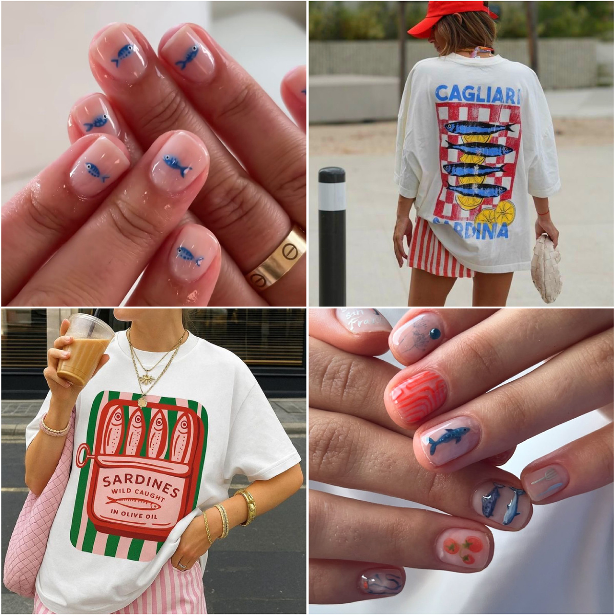 Это тренд, который вдохновлён морем, рыбацкой аутентикой, промокшими куртками, сетками, ветром в волосах и минимализмом. Эстетика Fisherman Core стремительно набирает популярность, вдохновляя дизайнеров одежды и, конечно же, мастеров маникюра. Футболки, платья, украшения и маникюр с рыбками вовсю покоряют соцсети. Новый арт-тренд, который ворвался в эстетику лета: игривый, странный, немного ретро и 100% Pinterest-вдохновляющий. Это когда каждый ноготь — как кадр из винтажной рекламы морепродуктов на итальянском побережье. В маникюре Fisherman Core проявляется через использование синих и голубых оттенков, напоминающих море, а матовое покрытие добавляет ногтям текстуры, схожей с потертым морской водой стеклом или галькой. Это лето 2025. И да — пусть на твоих ногтях будут сардины. Почему бы и нет? 🐟💅