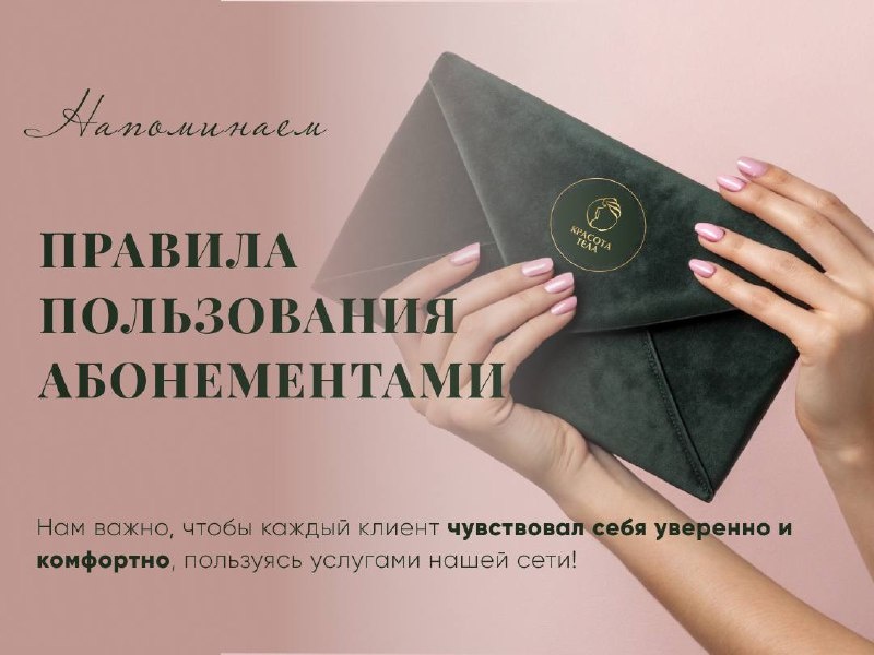 Дорогие клиенты, сегодня хотим напомнить вам про наши правила пользования абонементами 🙂 Эти правила созданы для того, чтобы каждый клиент чувствовал себя уверенно и комфортно, пользуясь услугами нашей сети 😌 1. Срок действия абонементов: 🙂Абонементы по регулярной стоимости: 90 дней* 🙂Абонементы серии LUXE: 120 дней* 🙂Акционные абонементы (фикс стоимость): 45 дней* либо согласно условиям акции - 30 дней *с момента активации абонемент считается активированным с первого посещения 2. Запись и отмена процедур: 🙂Мы заранее сообщаем о записи через WhatsApp, без подтверждения запись автоматически отменяется 🙂Отмена записи или перенос сеанса на другой день возможны за 24 часа, при более поздней отмене процедуры без уважительной причины, сеанс будет списан 3. Опоздание на процедуру: При опоздании на процедуру время сеанса сокращается на период опоздания 4. Заморозка абонемента: При необходимости возможна единоразовая заморозка до 30 дней 5. Результат: 🙂Для видимых резуль
