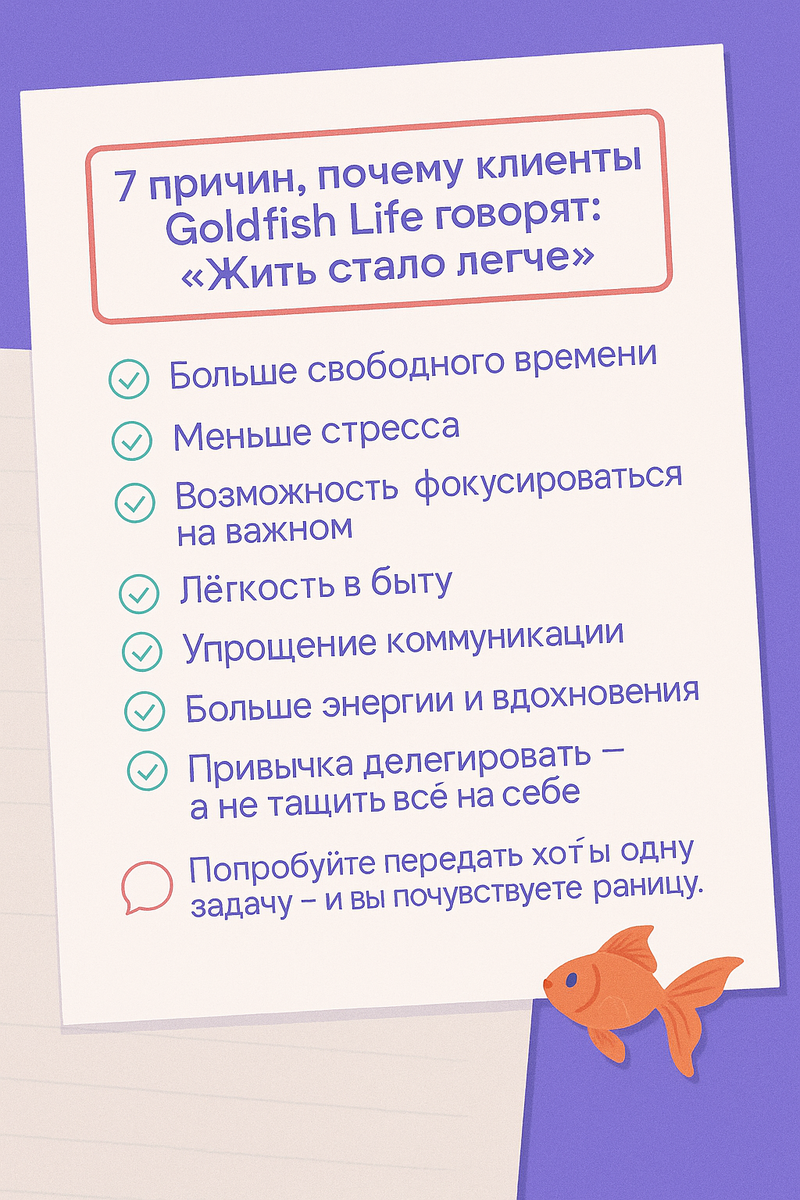 Как только вы начинаете делегировать, меняется не только ваш список задач. Меняется всё: 1️⃣ Больше свободного времени В день появляется 1–2 часа, которые раньше уходили на рутину. 2️⃣ Меньше стресса То, что раньше висело в голове (оплаты, записи, организация), теперь выполняется «само». 3️⃣ Возможность фокусироваться на важном Вместо «гасить пожары» — работать и жить по своим приоритетам. 4️⃣ Появляется лёгкость в быту Ассистенты помогают закрывать бытовые задачи: от поиска врача до брони доставки. 5️⃣ Упрощение коммуникации Вместо десяти переписок — одно сообщение ассистенту. Всё остальное — за кадром. 6️⃣ Вдохновение и энергия Мозг освобождается от перегруза. Приходит ощущение, что «я управляю своей жизнью». 7️⃣ Привычка не тащить всё на себе Самое ценное. Делегировать — это нормально. Это про уважение к себе и своему времени. 💬 Попробуйте передать хотя бы одну задачу — и почувствуете разницу. Сервис удалённых ассистентов для тех, кто ценит время. Мы берём на себя личны