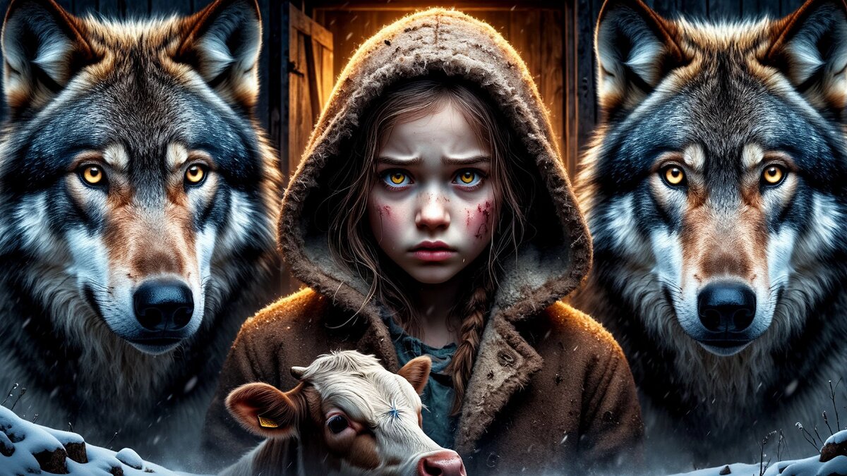 Первый волк прошёл по вонючей тропе, точно разведчик. Второй вынырнул, как тень, у двери хлева. Третий — старый, чёрный, с белым ухом — застыл в метре. Глаза — янтарные. Он смотрел на девочку и на корову.