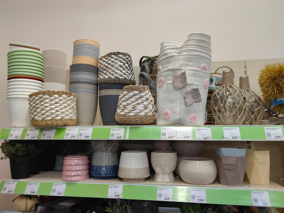 Как-то мы с вами обычно ходим все больше по горшкам и красивостям в Фикс-прайсе. А у меня вчера все более пользительный визит вышел, хотя на горшки и красивости я тоже посмотрела))))) Сегодня поедем в Калугу, я планирую там зайти в тот же самый богатого ассортимента Фикс, авось что-то интересненькое найдется. Ну а пока посмотрим наш деревенский)) Хорошего размера вот эти горшочки, жаль по стилю мне никак не подходят. Я люблю такие со вставочками. Совсем отказываюсь от горшков с поддонами. Только крупная керамика у меня остается с дренажными отверстиями и поддонами, а все остальное перевожу на пластик со вставками. Так удобнее. Нашла пластиковые опоры коричневые, но не нашла от них ценника. Кстати, раньше что-то не видела таких. Зато металлические двух вариантов бюджетные у нас всегда в наличии в магазине. Из красивенького нашла несколько подносов и коробку. В такие штуки красиво можно некрупные горшочки составить. Все смотрю на эту клеточку, к сожалению, некого мне в нее замуровать)))