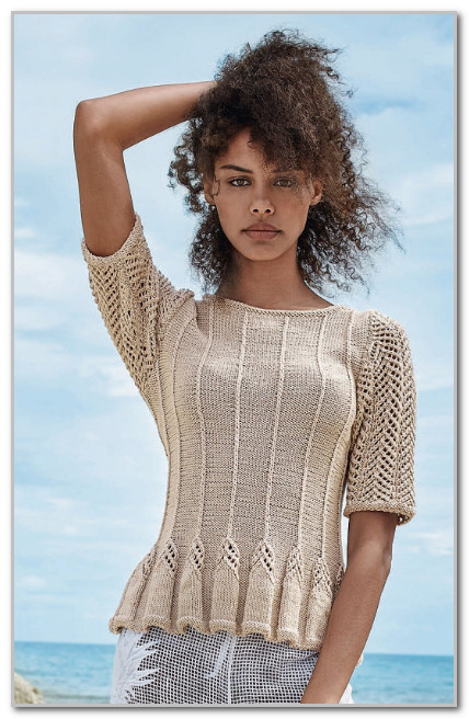 Легкий сетчатый узор на коротких рукавах и декоративно узорчатая, расклешённая баска придают этому летнему пуловеру женственный шарм.
