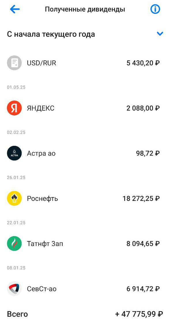 Подбил, полученные с начала текущего года, дивиденды. ИТОГО 47775,99 Пока сумма не впечатляющая. В прошлом году, к этому времени помимо вышеуказанных компаний, в мою дивидендную копилку попали взносы: ФосАгро, Норникель, Газпром нефть, Дороги и мосты, ЛСР, Лукойл. Но невыплаты отдельными компаниями не так уж и волнуют меня. Главное, что, если взглянуть глобально, компании платят. И если взглянуть на перспективы, они даже радуют (о них чуть позже). Каждый год находятся те, у кого возникают проблемы, и напротив, те, кто платит рекордные дивиденды. Ну и, разумеется, мои любимые "среднячки". 03.06.2025 Станислав Райт - Русский инвестор