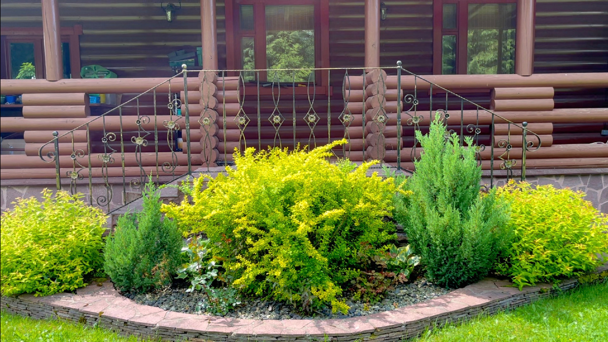 Барбарис желтолистный в центре и спиреи по краям были выбраны первыми. Понравилось сочетание яркой желтой листвы и "вишневого" фона камня (лемезит) на облицовке.