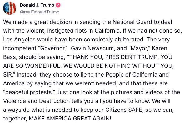 Трамп — о подавлении протестов в Калифорнии: Мы приняли отличное решение, направив нацгвардию на подавление насильственных спровоцированных беспорядков в Калифорнии. Если бы мы этого не сделали, Лос-Анджелес был бы полностью стерт с лица Земли. Trump zur Niederschlagung der Proteste in Kalifornien: Wir haben eine großartige Entscheidung getroffen, die Nationalgarde zur Niederschlagung der gewalttätigen, provozierten Unruhen in Kalifornien einzusetzen. Hätten wir das nicht getan, wäre Los Angeles komplett von der Bildfläche verschwunden.