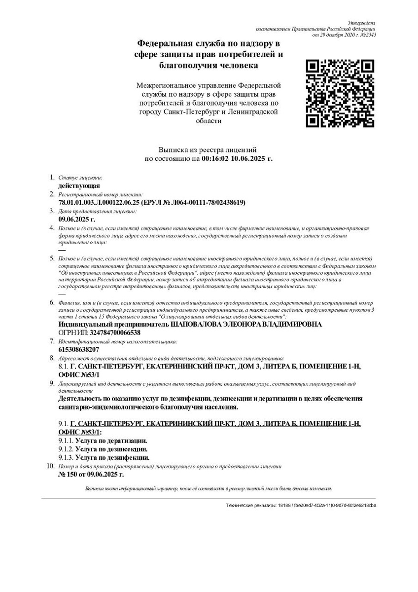 ЛИЦЕНЗИЯ. ОФИЦИАЛЬНЫЕ ДАННЫЕ ✍️ Теперь мы официально зарегистрированы как ИП и имеем все необходимые лицензии для работы. Это значит, что вы получаете услуги с гарантией качества и полной законности! ✅ 🔹 ИП:Шаповалова Элеонора Владимировна 🔹 ОГРНИП: 324784700066538 🔹 Лицензия: 78.01.01.003.Л.000122.06.25 Рады предложить вам профессиональные услуги с полной ответственностью! 💼✨