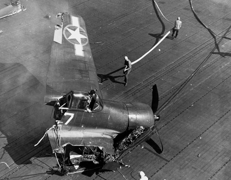 31 марта 1944 года над островом Палау разворачивалась яростная воздушная битва. Энсин Р. Блэк из 5-й истребительной эскадрильи (VF-5) авианосца USS Yorktown (CV-10) вел свой Grumman F6F-3 Hellcat в атаку на японские укрепления. Внезапно зенитный снаряд пробил правое крыло его истребителя, оставив полуметровую пробоину, повредил гидравлическую систему и элероны. Самолет превратился в едва управляемую развалину, но Блэк отказался прыгать с парашютом над вражескими водами . Технический ад: Состояние “Хеллкэта” после атаки - Конструктивные повреждения: Отсутствие гидравлики лишило пилота тормозов и контроля закрылков. Правый элерон висел бесформенными лоскутами, а балансировка машины нарушилась из-за дыры в крыле. - Аэродинамический кошмар: При снижении самолет тянуло вправо, требуя постоянного давления на педаль руля направления. Любая ошибка грозила сваливанием в штопор . - Прочность планера: Цельнометаллическая конструкция F6F (толщина обшивки хвоста – 2.6 мм) и трапециевидн