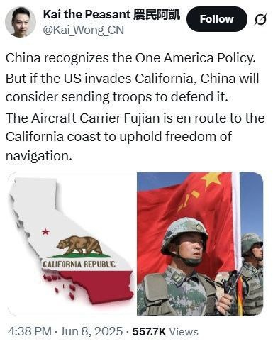 Китай привержен принципу «Единой Америки». Однако если США решатся на военное вторжение в Калифорнию, Китай оставляет за собой право направить туда войска для защиты штата. Авианосец «Фуцзянь» уже совершает переход к берегам Калифорнийской Народной Республики для обеспечения свободы судоходства. Это конечно шутка, но ведь США именно так и делали последние 130 лет.