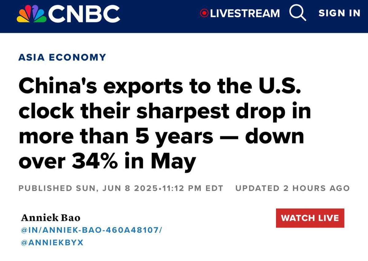 Искусство громких заголовков от CNBC: Экспорт Китая в США зафиксировал самое резкое падение за последние 5 лет - в мае снижение составило более 34% Это самое сильное падение этого показателя с февраля 2020 года, когда пандемия COVID-19 обрушила всю мировую торговлю. Из-за столь серьезного сокращения поставок в США ВЕСЬ объем китайского экспорта оказался хуже прогнозов аналитиков. Он ВЫРОС на 4,8%, в то время как аналитики, опрошенные Reuters, ожидали роста на 5% Вы поняли? Экспорт Китая в США так обрушился, что весь экспорт страны ВЫРОС не на 5%, а всего лишь на 4,8%🤡 Это означает лишь одно - Китай нашёл как поставлять свои товары на рынок США через третьи страны минуя пошлины☝️ Но Трамп, конечно, "победил"!!!