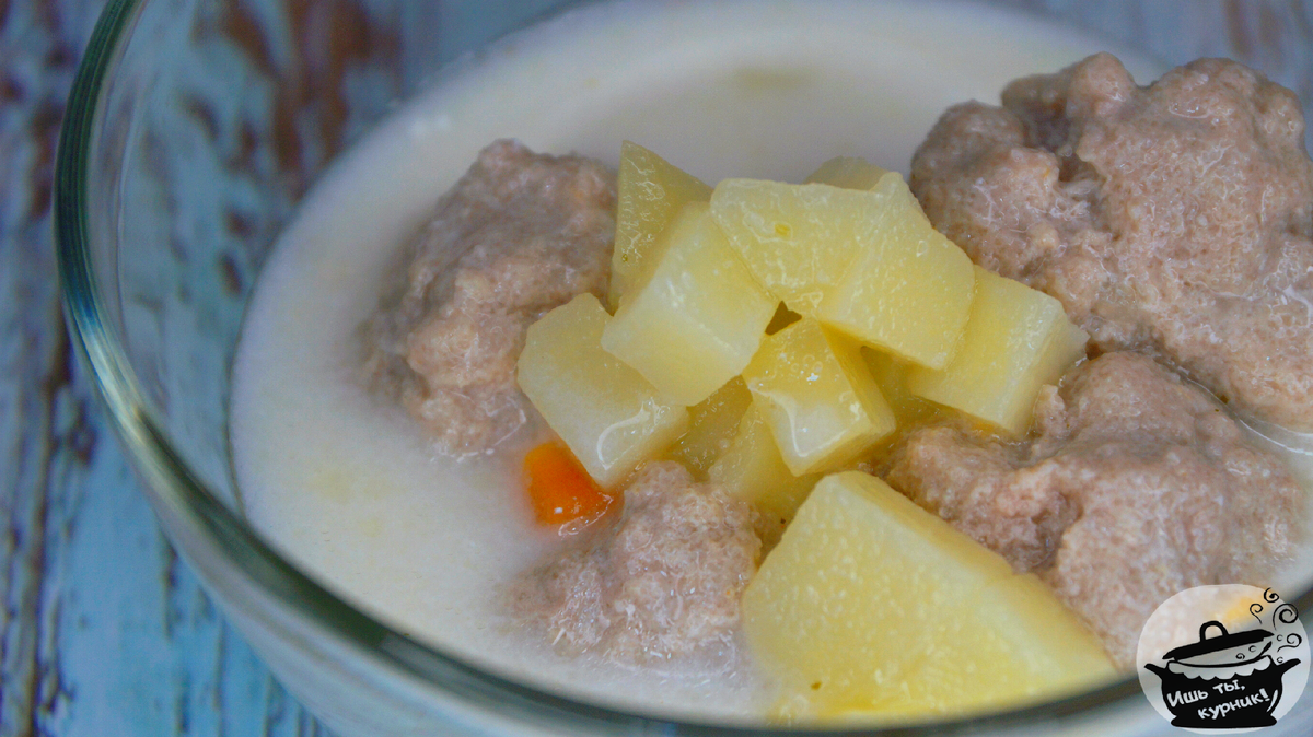 Ингредиенты: · картофель – 3 шт.; · морковь – 3 шт.; · плавленый сырок – 1 шт.; · фарш мясной – 200 гр.; · яйцо – 1 шт.; · манка – 1-2 ст.л.; · сметана для подачи. Приготовление: картофель и морковь очистить и мелко порезать. Вскипятить воду с лавровым листом, положить овощи, варить 10 минут. Фарш смешать с яйцом и манной крупой, сформировать фрикадельки размером с грецкий орех, выложить в суп, дать закипеть, посолить, варить еще 5 минут. Добавить тертый плавленый сыр, проварить до полного растворения. Перед подачей добавить сметану. Приятного аппетита!