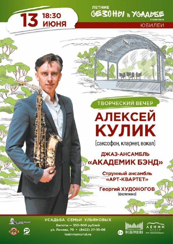Алексей Кулик. Творческий вечер 🗓️13 июня в 18:30 📍Городская Усадьба семьи Ульяновых Юбилейный творческий вечер Алексея Кулика (саксофон, кларнет, вокал). Осталось несколько билетов. Подробнее Скидка для вас по промокоду культура ✨ #13июня25