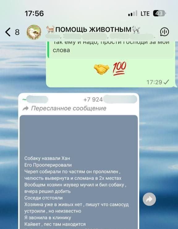 Житель Приморья наказал односельчанина за издевательства над собакой В Приморском крае возбуждено уголовное дело по факту причинения тяжкого вреда здоровью, повлекшего смерть 49-летнего жителя села Новокачалинск. 8 июня между мужчинами произошёл конфликт. 56-летний местный житель избил потерпевшего — как он сам признался, причиной стало возмущение жестоким обращением погибшего с собакой: ранее тот сильно избил животное. Потерпевший получил несколько ударов по голове и телу. Согласно заключению эксперта, смерть наступила от тупой травмы живота. Подозреваемый задержан, решается вопрос о мере пресечения. Пса которого 8 июня в Ханкайском районе жестоко избил собственный хозяин доставили во Владивосток. У него перелом челюсти, проломлен череп в двух местах, проломлена глазница, голова просто кровавое месиво! Ночью Хану сделали операцию, по частям собирали голову, сложили челюсть, собака в тяжелом состоянии, но он живой, он боец!