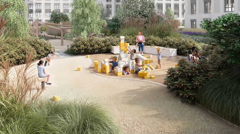 Большое внимание девелоперы уделяют разнообразию сценариев на детских площадках. На эту задачу работают разнообразные материалы, обладающие разными тактильными свойствами, наличие внутри двора источника воды — фонтана или водоема — и природных элементов. Чем больше во дворе возможностей для творчества и фантазии, тем больше будут увлечены дети.