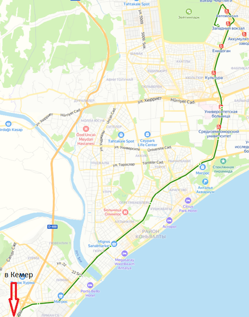 Три наших автобуса АК03, ТА08 и КА07 отправляются с автовокзала Антальи, идут через Мигрос 5М и район Коньялты, и дальше вдоль побережья (см схему 1 ниже).